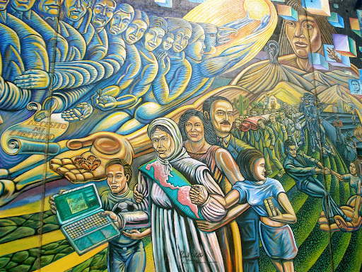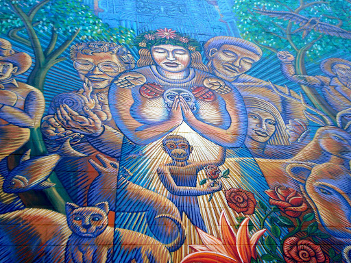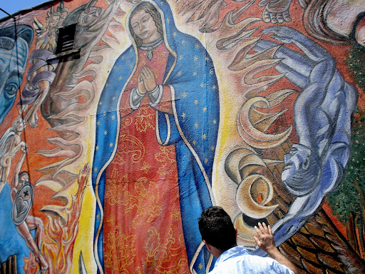 The image represents is a tribute to the Virgin of Guadalupe from a contemporary perspective. It consists of two giants on either side of her which represent his concern for the environmnt and education. Unfortunately, I only have a close up shot but a quick google search can give you a better range. Like this, much of his work seems to channel his older brother, David Botello, who introduced mural painting to him at an early age.