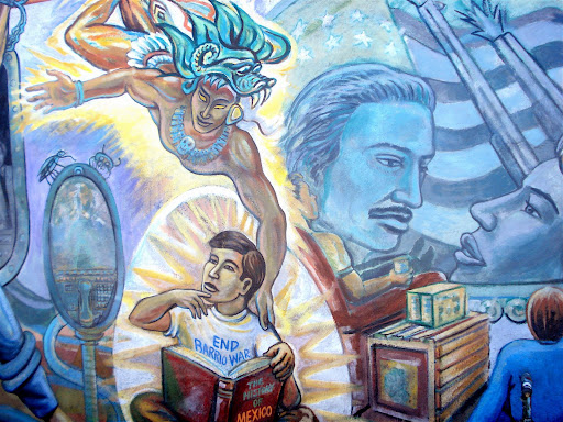 Here you see a young man turning away from what his family is doing (watching American TV) and is being inspired by an ancient pre-columbian deity Quetzalcoatl, as he reads a book on Mexico. It’s sad that such work gets destroyed when others decide to tag over. There is such a strong message about control and education that its spoiled by selfish acts.
