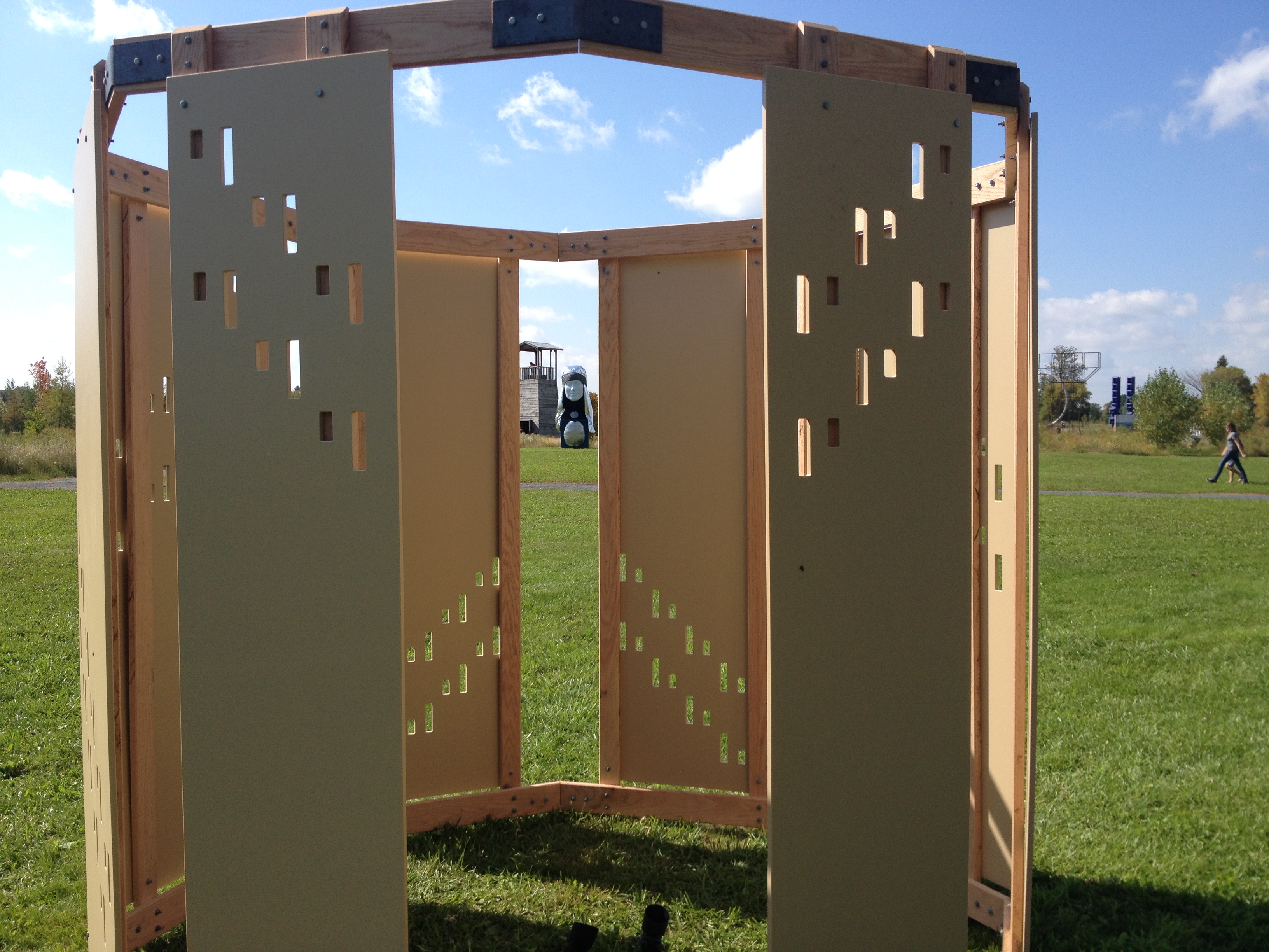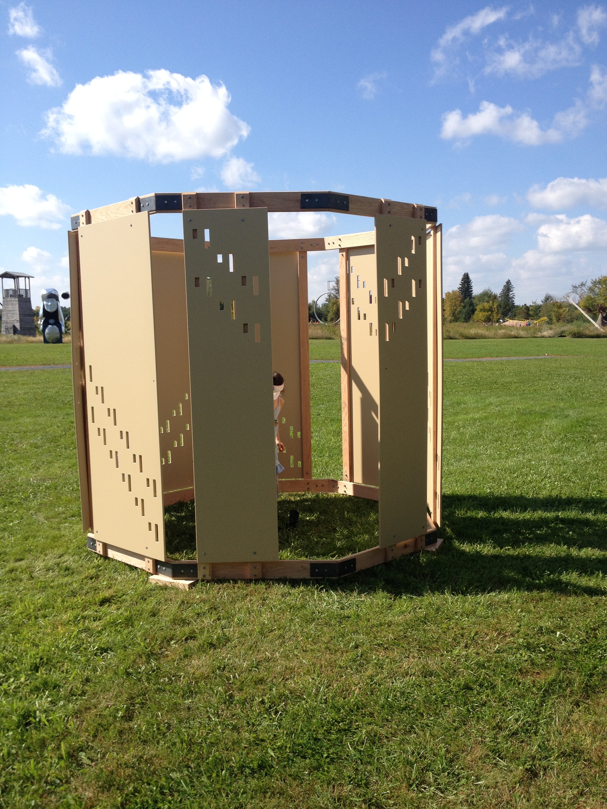 Through a lot of process work and generating ideas we ended up designing a piece that was inspired by a zoopraxiscope, an early type of projector which cast images from rotating glass disks in rapid succession to give the impression of motion. We envisioned creating a giant one in which visitors could interact with and spin and change out images themselves. But due to a few factors that project became simplified and eventually we started focusing on the concept of vision restriction and framing and light. We eventually came up with this form that intermingled all three of these concepts. While its is not the most interactive sculpture, from within it, it does change the way that the park is experienced.
